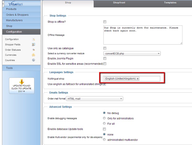 Certifique-se de ter configurado o idioma padrão em sua loja VirtueMart antes de iniciar a transferência de dados, faça login no seu Painel de administrador do Joomla! E vá para a seção VirtueMart. Em seguida, selecione a guia Configuração e escolha o idioma.