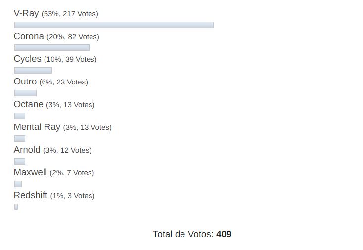 Qual desses você considera como seu principal mecanismo de renderização? Nesta pesquisa o Vray se destacou como o mais usado por artistas 3d. Confira: