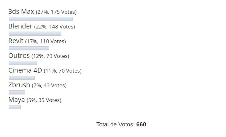 Pesquisa realizada para saber qual as pessoas consideram como seu principal software de modelagem 3d, apontou que a maioria faz uso do 3ds Max. Veja resultado abaixo: