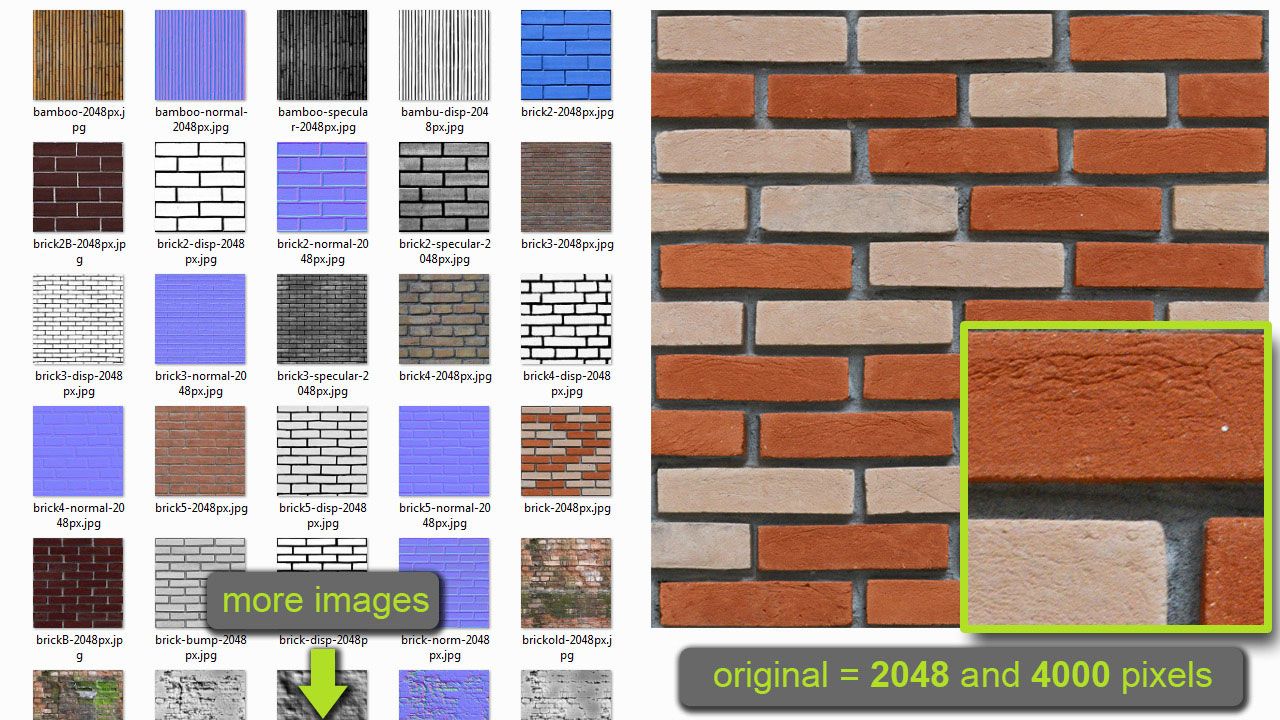 exemplos de materiais e texturas de diferentes muros com exclusivos canais normalmap e displacement, que fazem parte da coleção Total Image