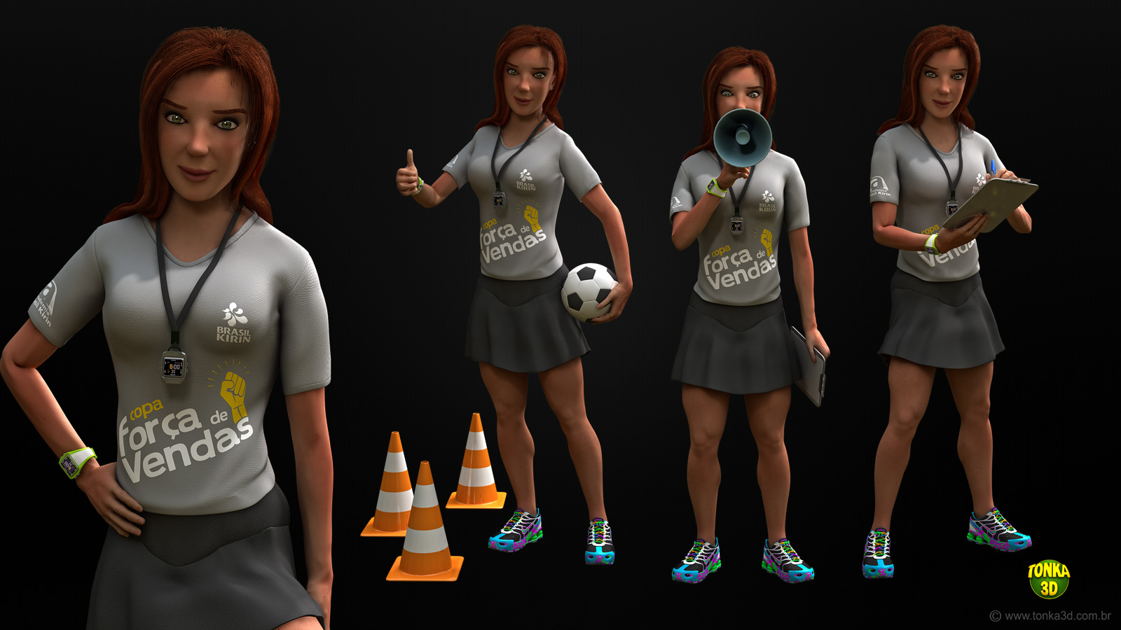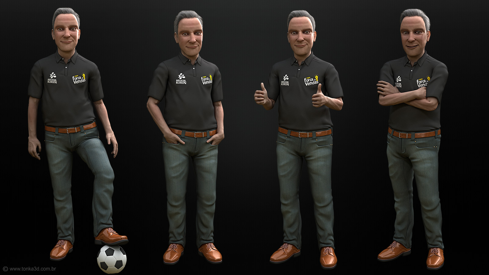 Exemplos de personagens 3D feitos para publicidade, em estilo cartoon ou realista, para projetos de visualização, impressos ou manuais, conforme necessidades mais específicas do cliente. Também podem ser animados para produção de vídeos institucionais, trailers, filmes etc.
